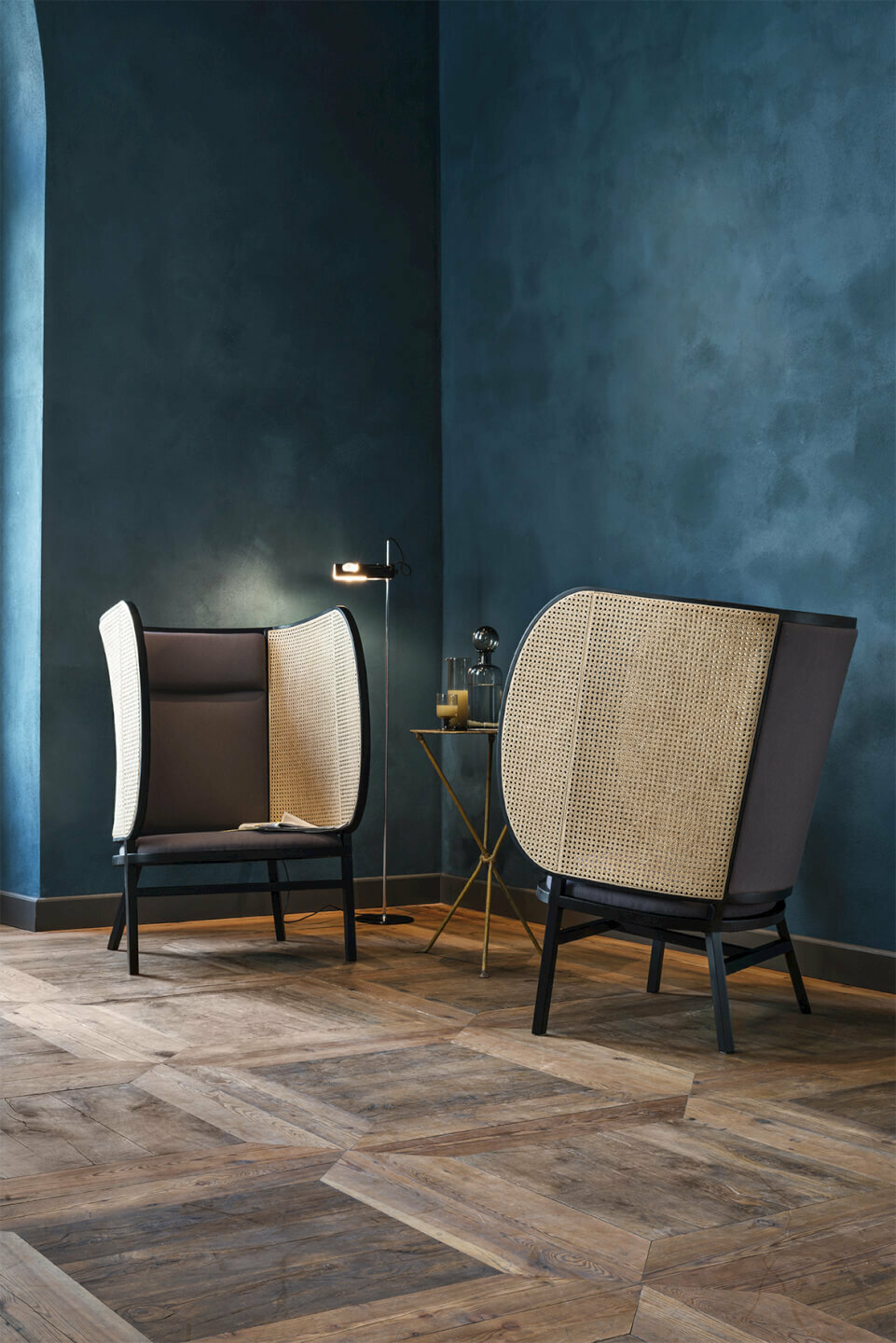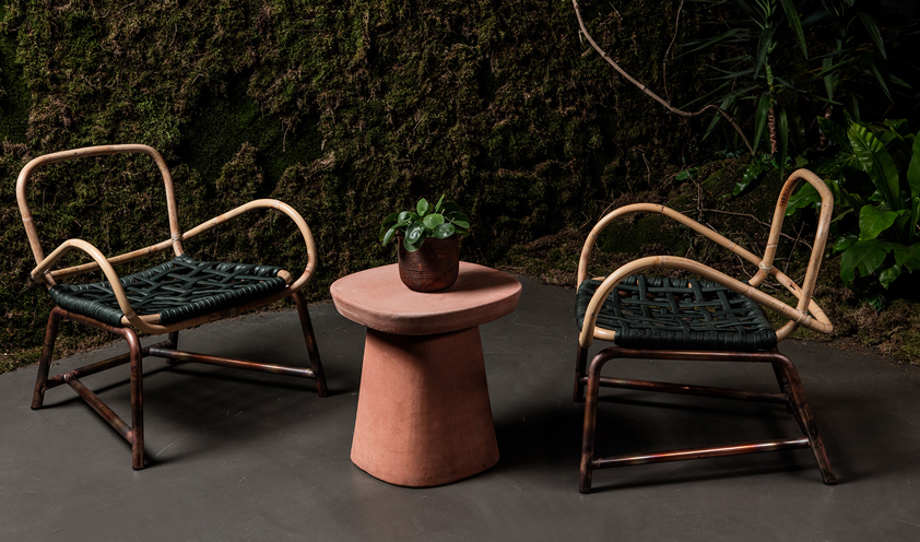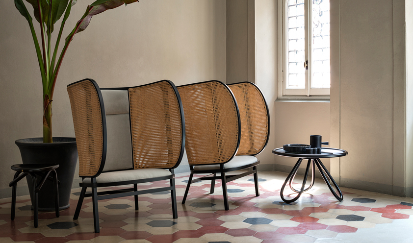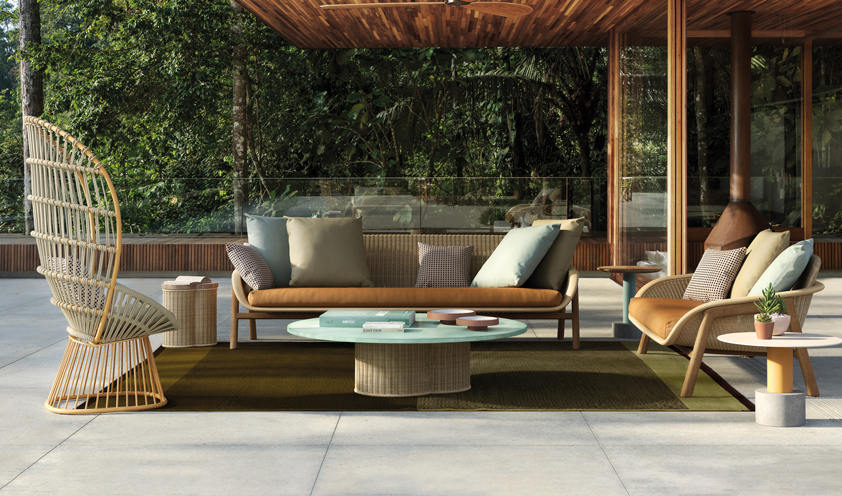 The large Vienna straw panels of the Hideout seat, designed by the Front studio, are a tribute to the production tradition of Gebrüder Thonet Vienna but also a stylistic innovation that interprets the concept of the seat with a peacock back in a contemporary key. The hut effect makes us feel protected and comfortable thanks to the padded seat and backrest. On the other hand, the Manila seat, designed by Paola Navone for Baxter, is an example of outdoor style perfect for indoor: the weave is in leather and the structure in acid-etched copper, a game of materials combined together to evoke the wicker seats. And speaking of wicker, Patricia Urquiola’s Vimini collection for Kettal is a tribute to this material, of which the architect says: “When you approach, you feel as if you are in front of an object of memory: it makes you feel at home”.