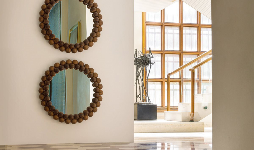 Expanding the perception of space, reflecting the image of plants invading the house and creating precious reflections of light: there are many things a mirror can do, and the Pearl collection by Porada is also a sculptural and decorative element thanks to its frame compost of 60 solid American walnut spheres.