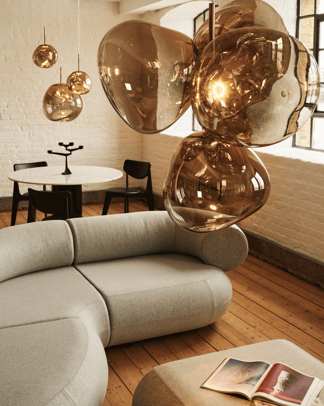 Another line of continuity is embodied by Tom Dixon. The British brand, founded in 2002, has a very distinctive visual language, which has evolved but never broken. This language is based on material research, metal finishes, and an industrial chic that is both elegant and refined. The brand’s identity has been shaped by its continuous research into materials and production methods, from the salvaged furniture characterized by metal welding in the 1980s to the ‘S’ Chair and lighting collections like Melt or Beat.