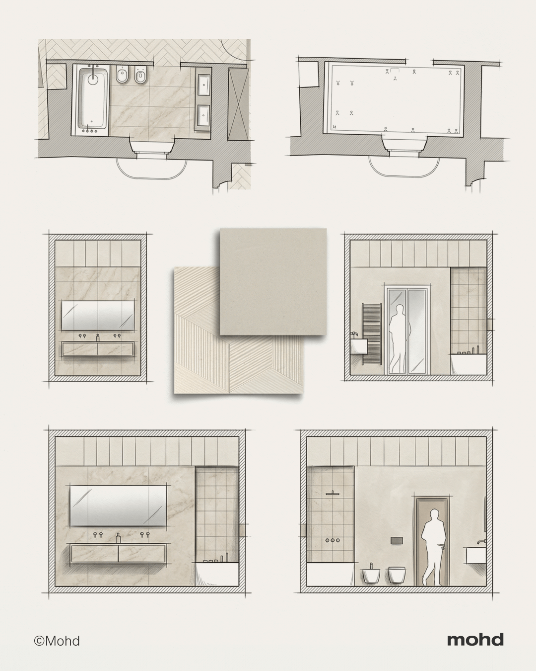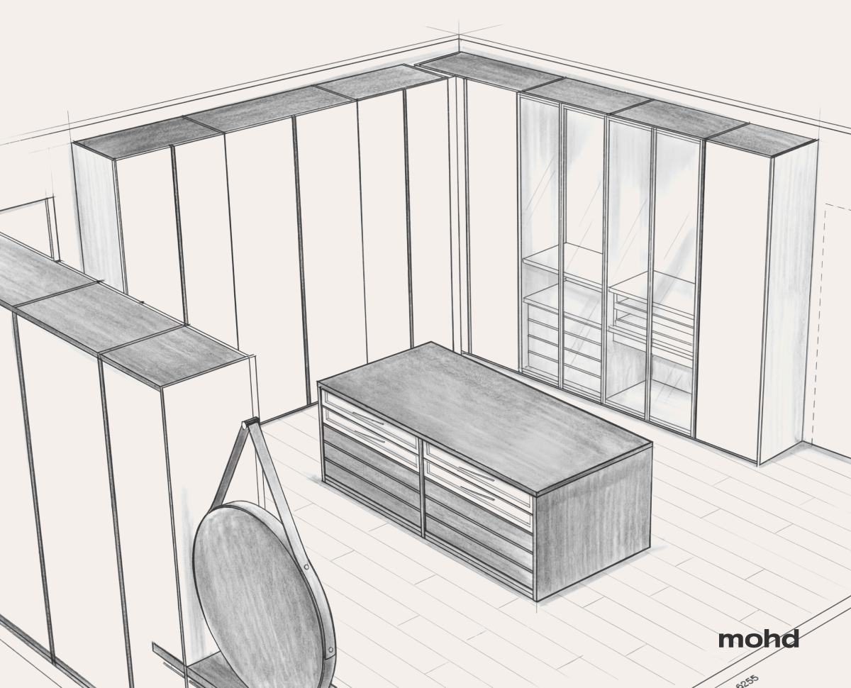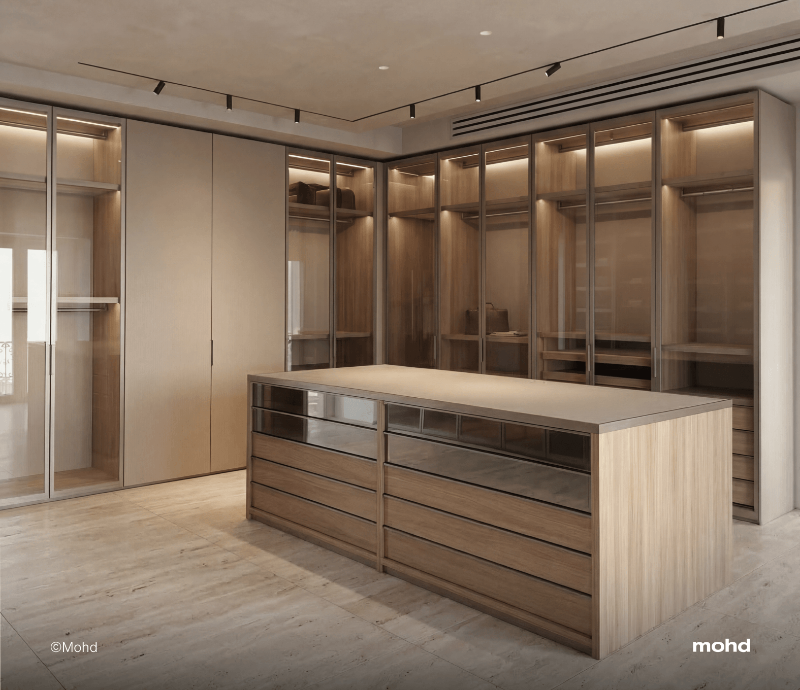 Mohd supports the interior design process through a curated selection and coordination of finishes, flooring, color palettes, and bespoke solutions. From the kitchen to the bathrooms, through to storage systems and the walk-in closet, each choice contributes to building continuity and coherence. Rather than defining a fixed outcome, the project develops a shared design framework capable of accommodating variation while preserving the overall identity of the home.