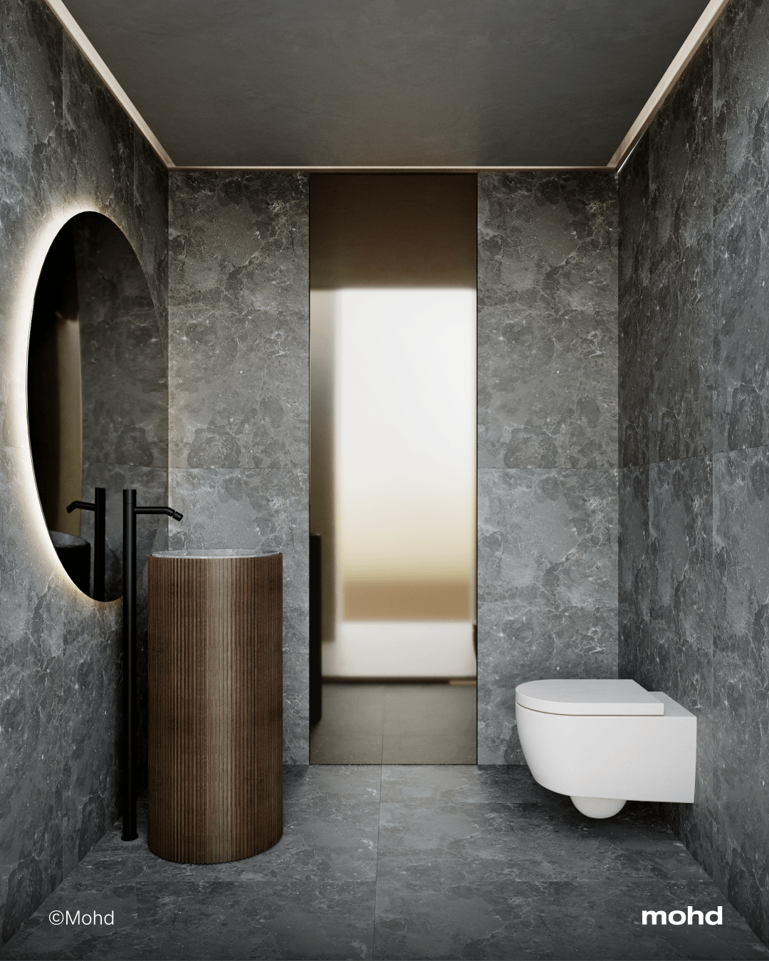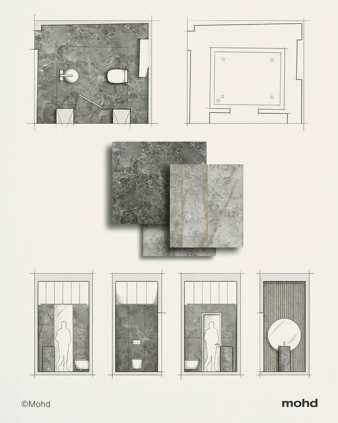 In the bathroom serving the living area, two proposals define distinct atmospheres.