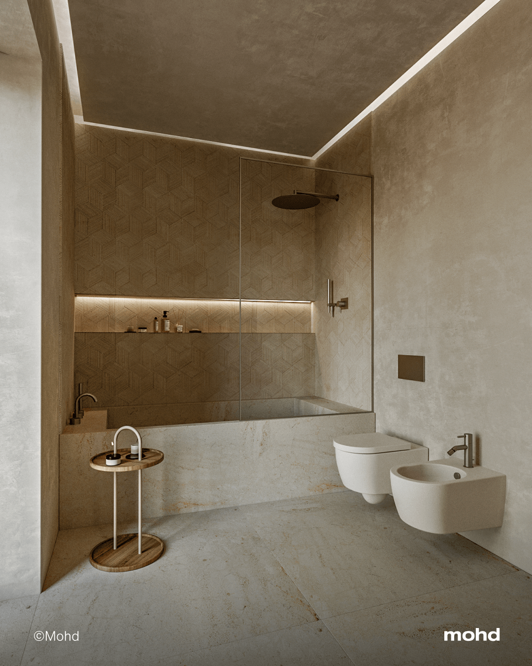 In contrast, the cream-toned natural stone introduces a brighter, more diffused atmosphere, offering a more open perception of space.