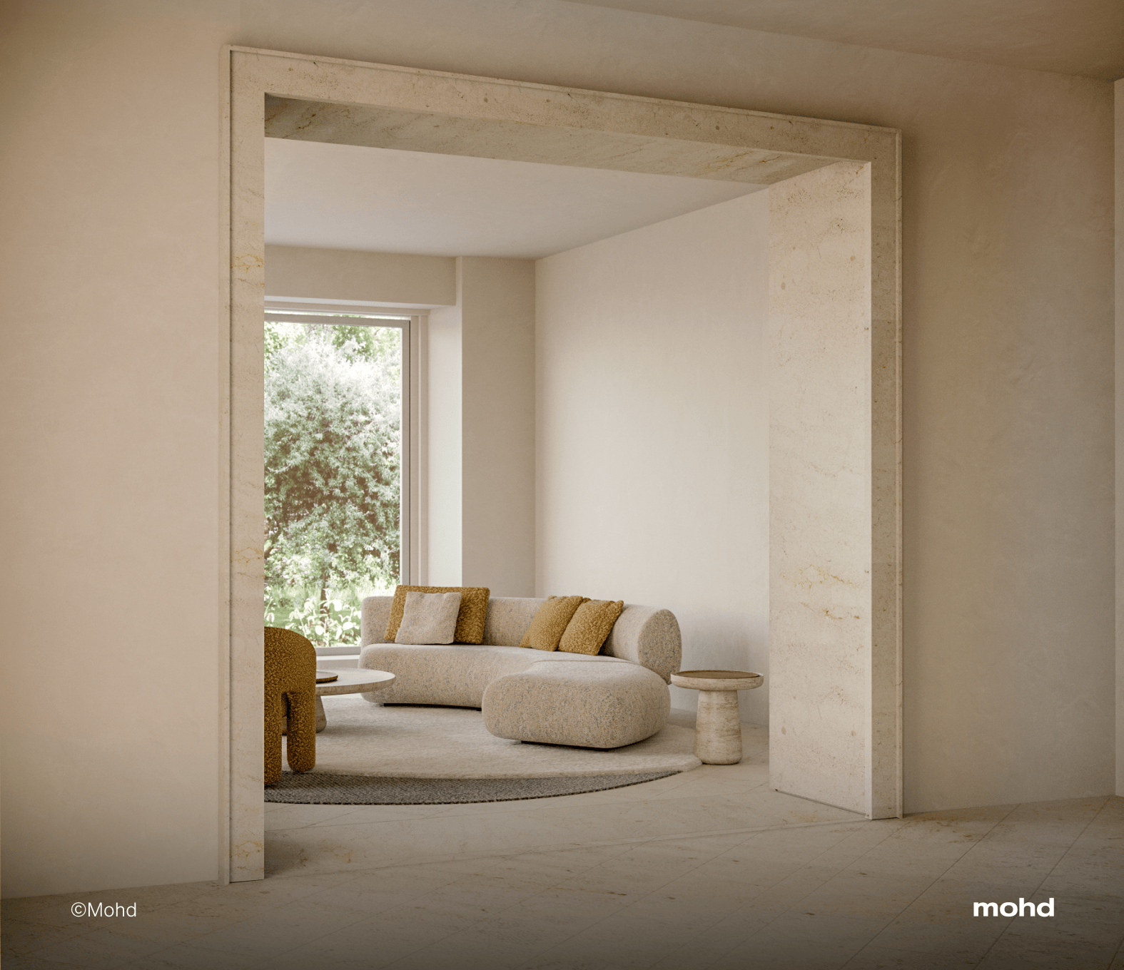 Natural stone surfaces, from travertine to onyx, introduce depth and subtle variation, while wooden elements bring an organic, grounded warmth. Bouclé and chenille fabrics create a sense of layered softness, balanced by more structured textures and refined finishes.
