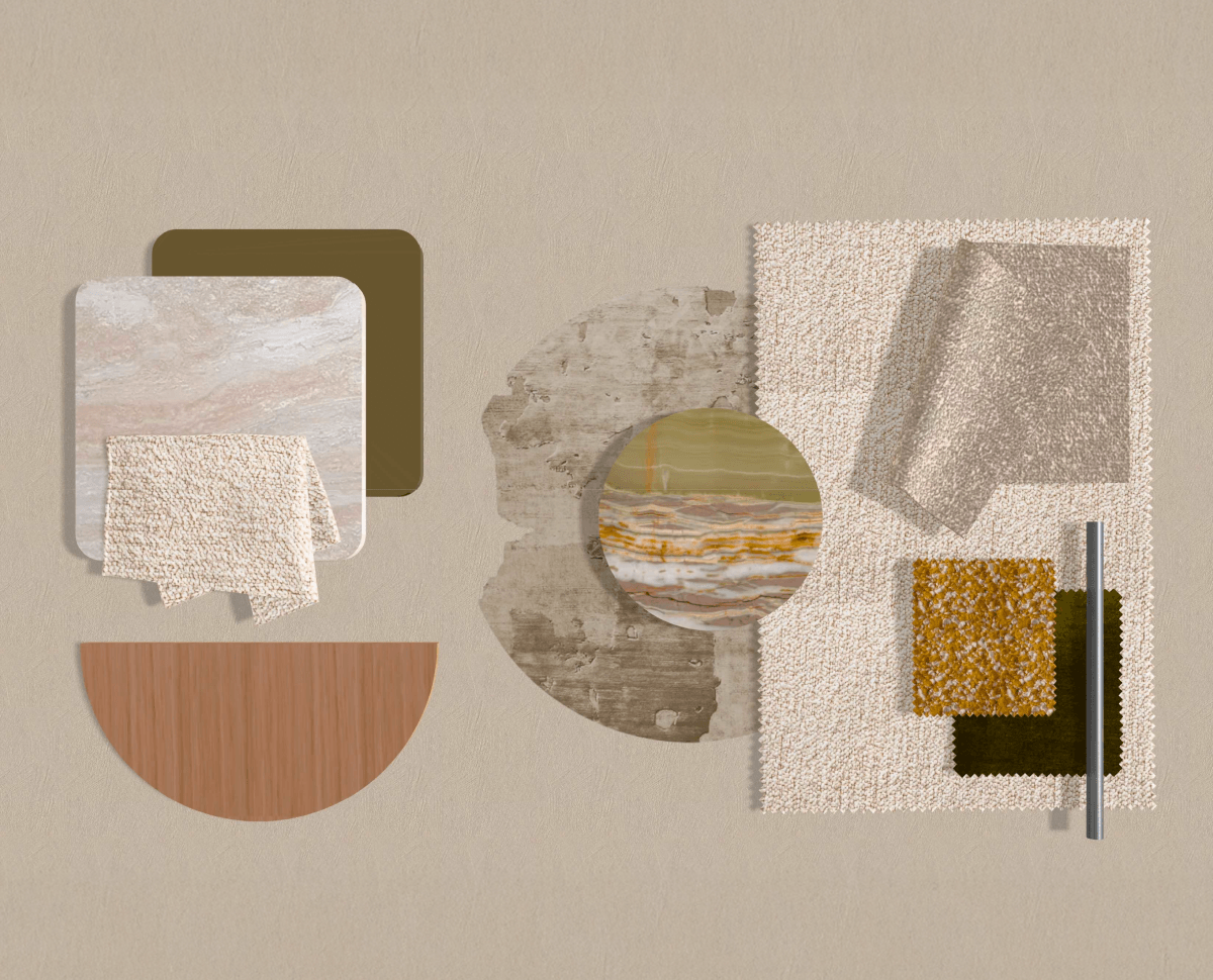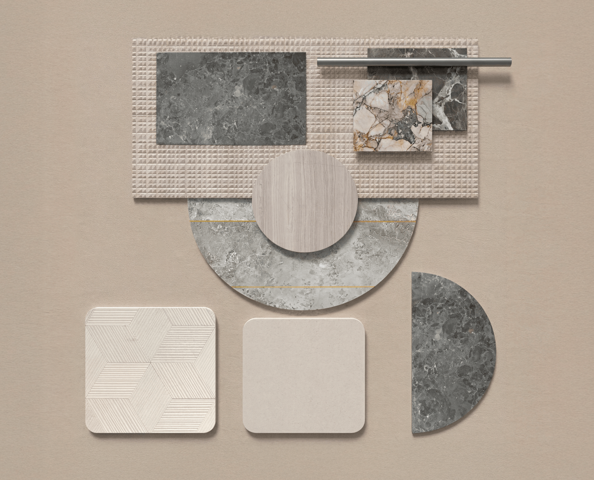From Gris du Marais to Silk Georgette and Crema d’Orcia, the project operates through controlled variations, where flooring, thresholds, portals, and walls contribute to defining spaces that are coherent, calibrated, and distinct.