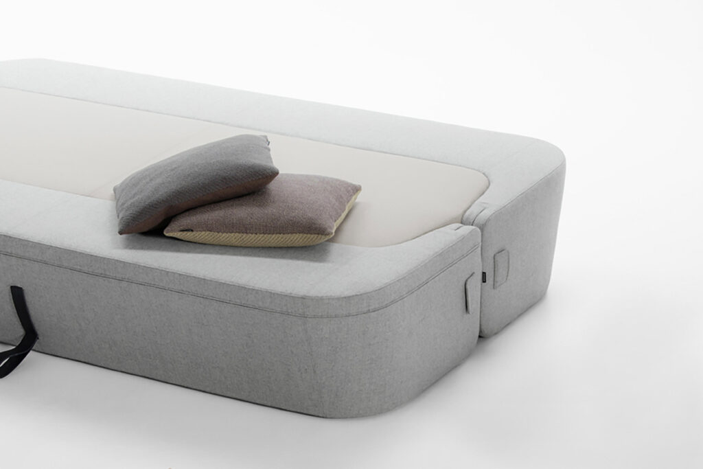 I classici divani letto di un tempo presentavano complicati e pesanti meccanismi che rendevano l’apertura e la chiusura difficili. Il punto di partenza di Revolve è proprio la volontà di superare questi meccanismi e renderli agevoli e immediati. In che modo? Lo schienale ruota di 180° intorno alla seduta e diventa cornice del letto. Aperto oppure chiuso, Revolve può essere posizionato a centro stanza così come a parete.