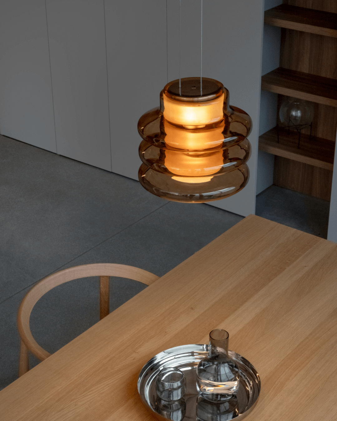 La rotondità incontra il colore nella collezione Pace: incantevole nelle tre versioni da terra, a sospensione o da tavolo, questa lampada può essere composta dal singolo elemento oppure da più elementi sovrapposti. I colori sono appena accennati e valorizzano ulteriormente la bellezza del vetro, che si conferma materiale di elezione per le luci più sofisticate. Non a caso l’intento dichiarato dell’azienda è fondere design e arte contemporanea dando vita a nuove forme di percezione visiva.