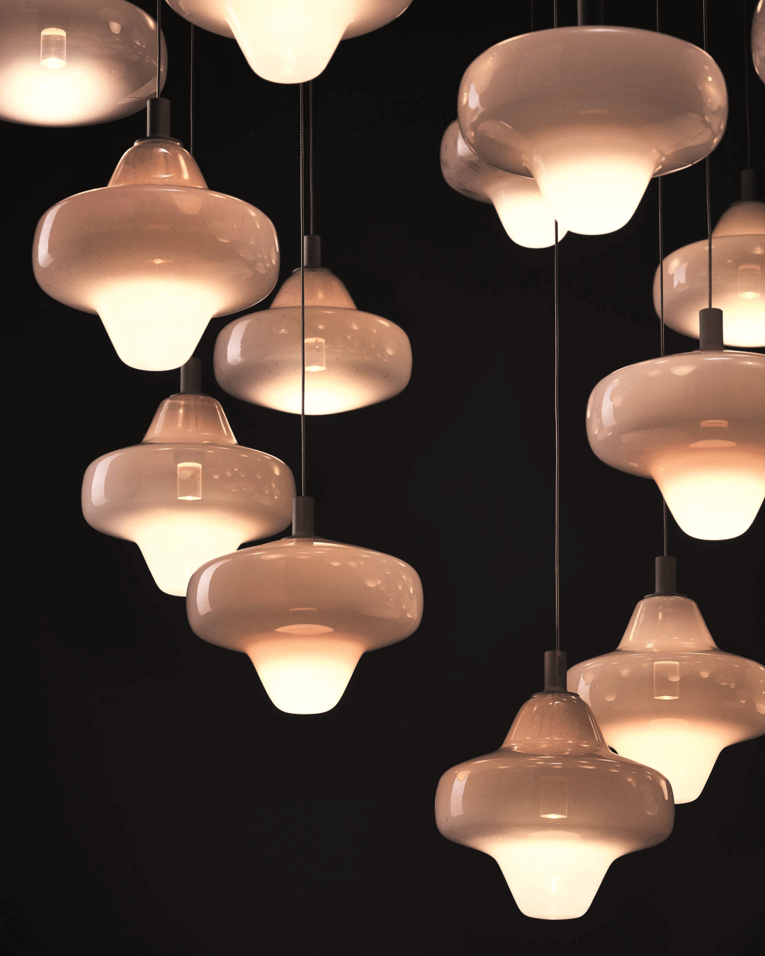 Lucie Koldova, direttrice creativa di Brokis, ha disegnato questo sistema modulare per l’illuminazione ispirandosi a forme astrali e individuandone tre da combinare insieme. Si tratta di Atria, Vega e Lyra e differiscono tra loro per piccoli dettagli formali, differenze appena accennate che rendono i tre elementi pendenti perfettamente combinabili tra loro. Interessanti anche le finiture: bianco opalino, perla rosa opalina e grigio opalino. La collezione prevede sei configurazioni predefinite ma è possibile crearne ulteriori in base ai propri desideri.