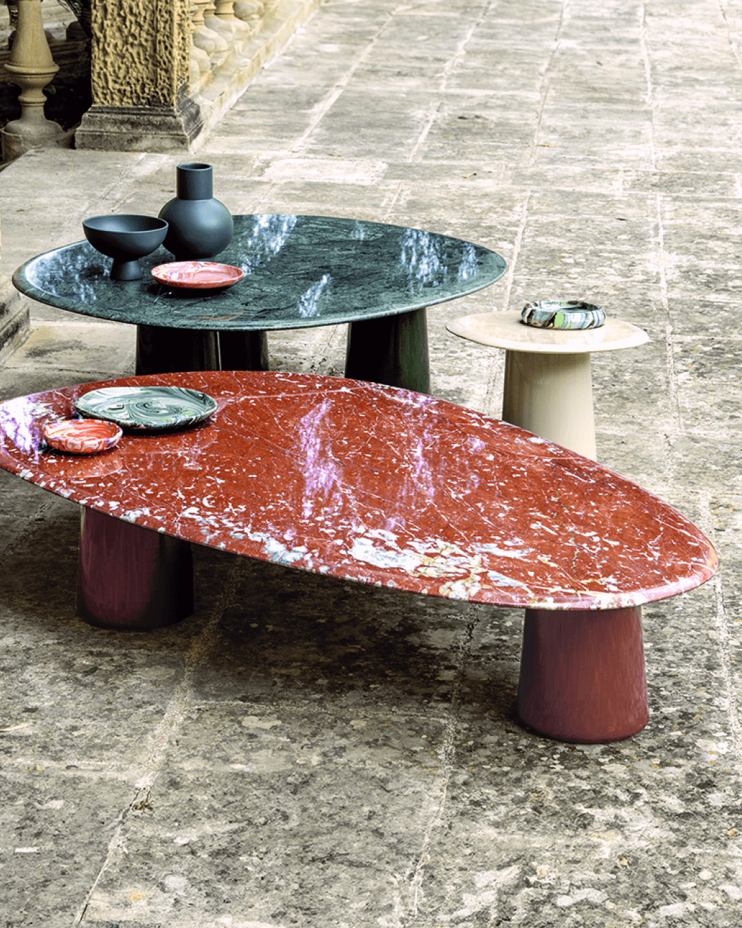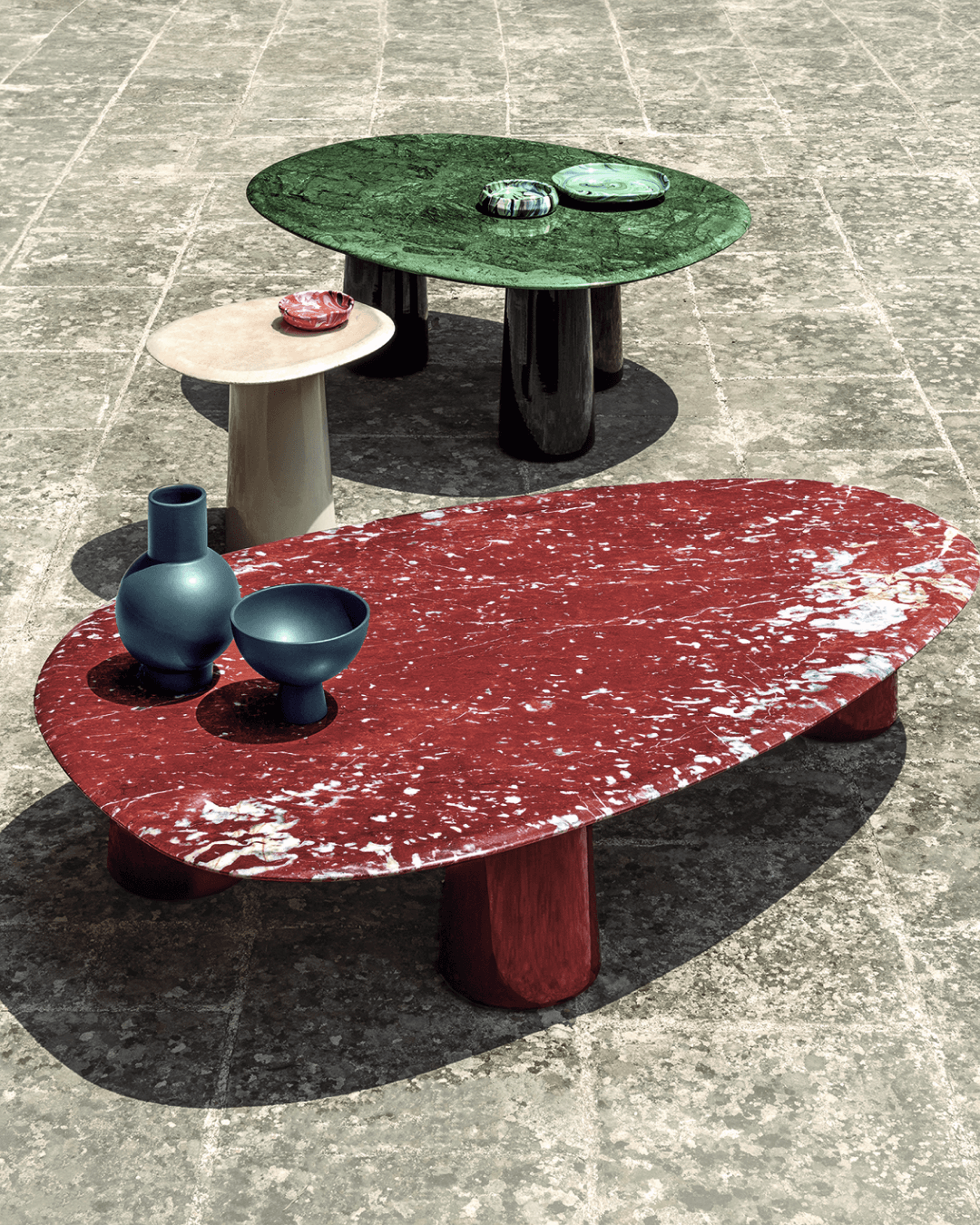 Ethimo arricchisce lo spazio outdoor con arredi scultura di altissimo profilo. Si tratta dei tavolini Boldini, emanazione del tavolo da pranzo Bold, ispirato alle architetture megalitiche. I colori sono intensi e brillanti, grazie ai preziosi marmi selezionati: Rosso Francia, Verde Guatemala o travertino color Sabbia, abbinati alle gambe in ceramica smaltata.