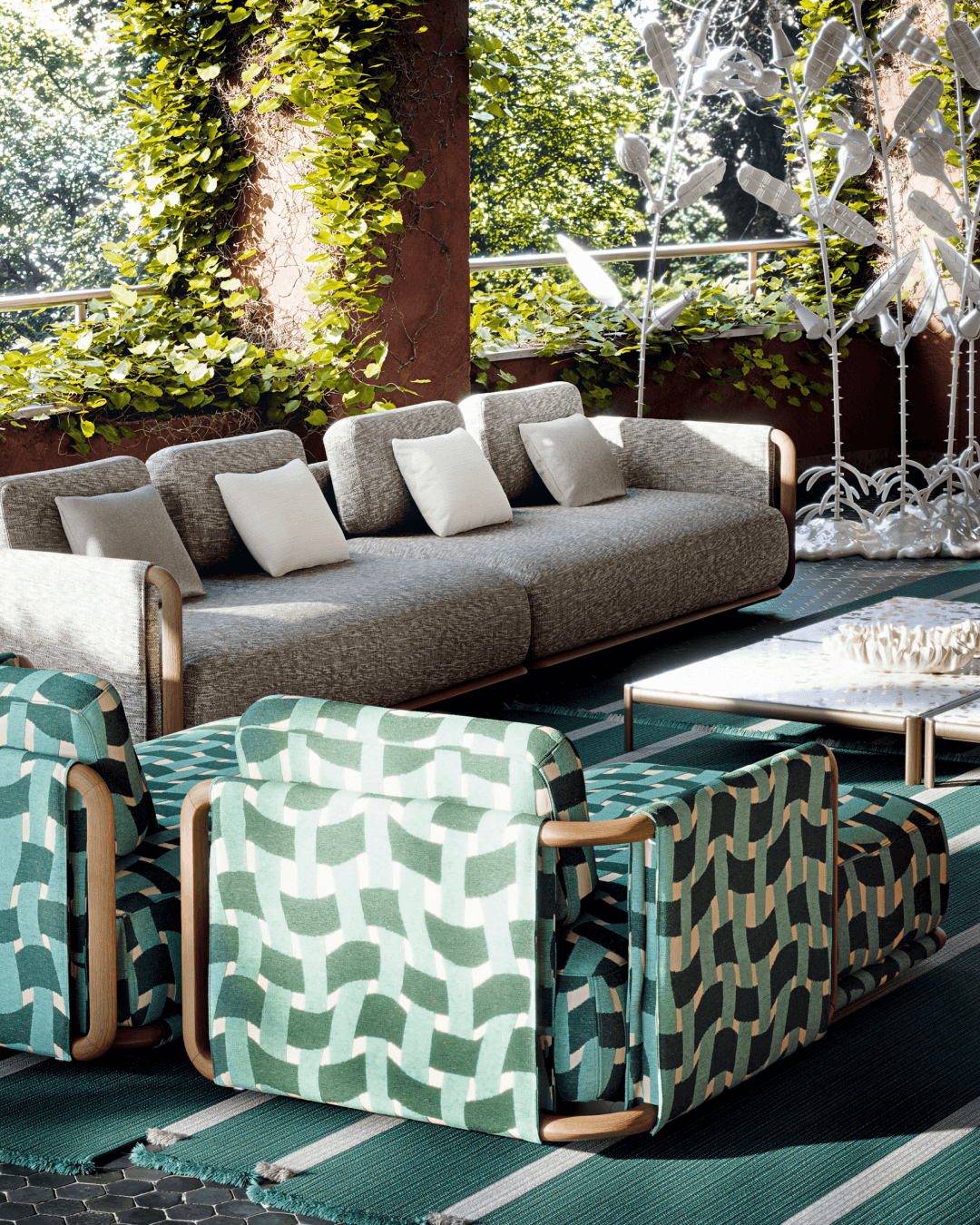 Tra le nuove collezioni presentate da Talenti si fa notare, in particolare, Flow di Ludovica Serafini + Roberto Palomba. Il nome è una dichiarazione di intenti: rendere fluida e confortevole la vita all’aperto. Grazie a cuscini avvolgenti, motivi rigati e fasce in legno dalle forme arrotondate che fanno pensare all’abbraccio della natura. Un salotto vivace e sofisticato per accogliere gli ospiti e rilassarsi all’aperto.