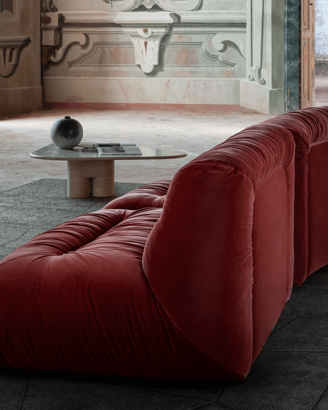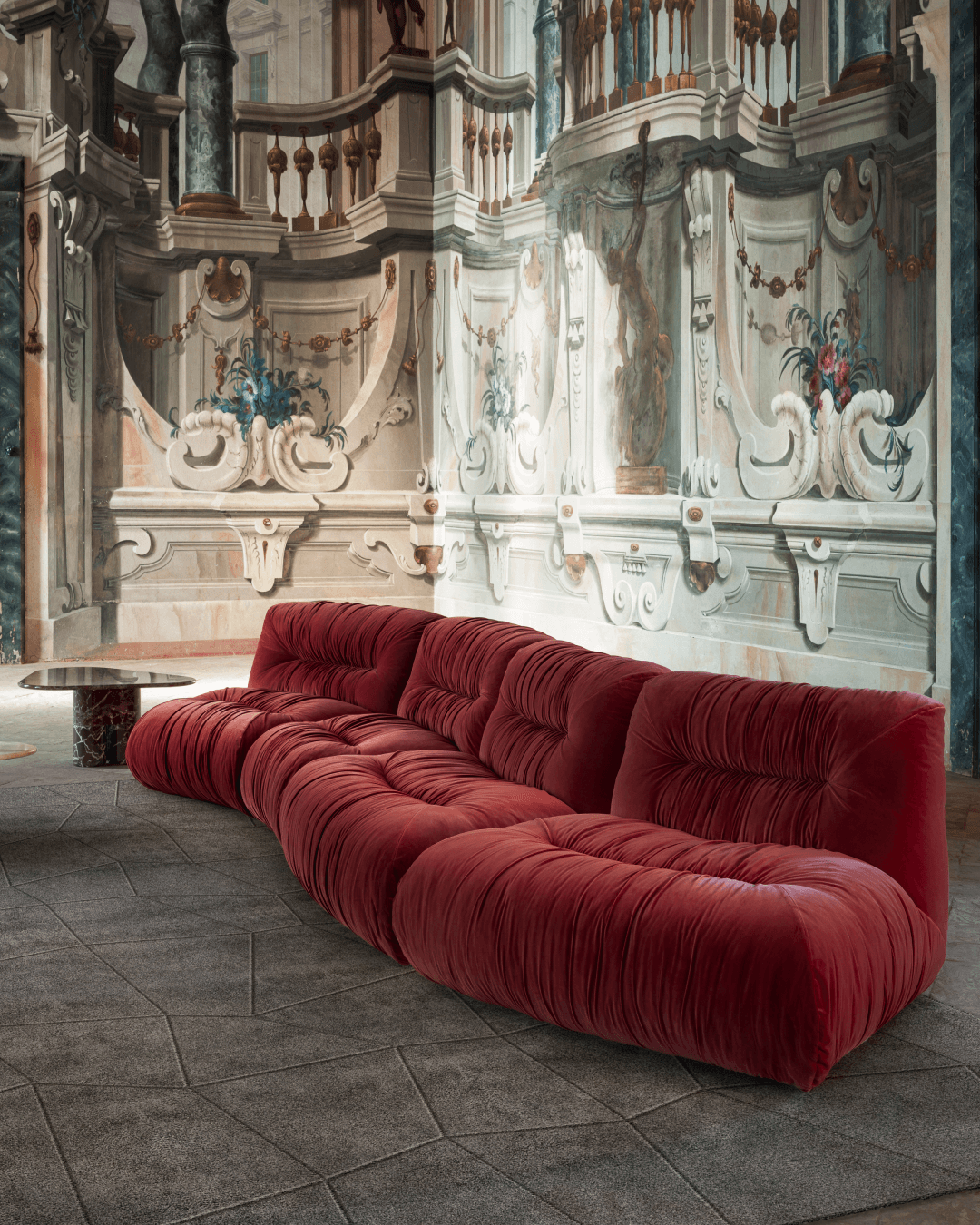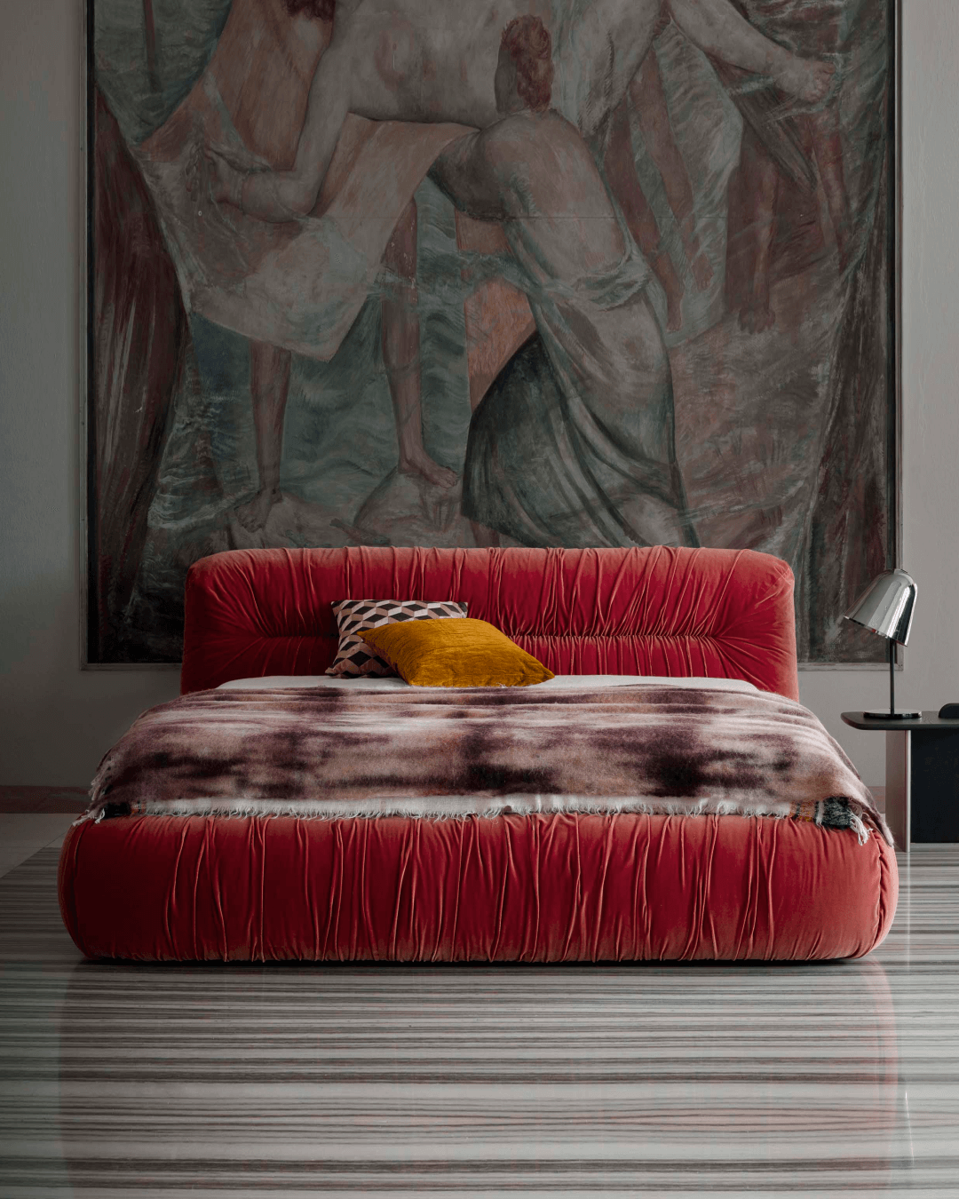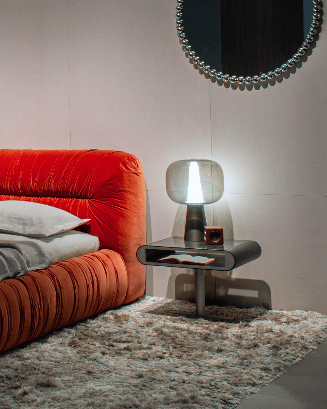 Sono visioni fugaci a cui mi attacco con fantasia, cercando anche poi delle motivazioni. Avevo voglia di disegnare un divano con una seduta fluida, continua, senza spigoli, con il drappeggio che per me mi ricorda un abito e quindi il mio background sicuramente principale. Quindi Mambo nasce dall’idea di un corpo in movimento, con un abito fasciato. Nella versione letto chiaramente la forma non è sinuosa perché la funzione richiede una determinata proporzione e quindi non ci sono grandi margini di fantasia. Accanto abbiamo messo un comodino, si chiama UFO perché l’ispirazione è quella del cartone animato i Pronipoti, con il piano in vetro così se sotto, ad esempio, c’è un libro si vede la copertina.
