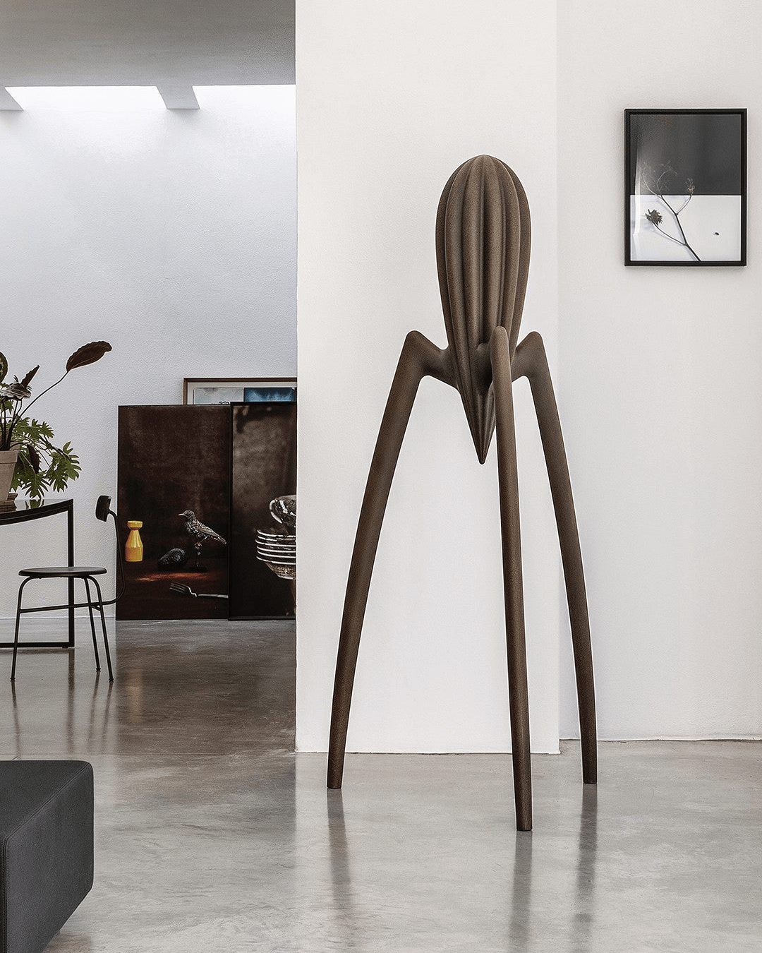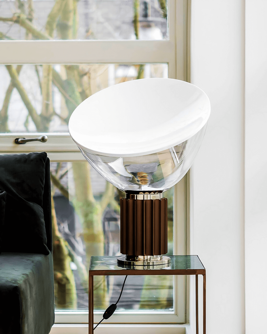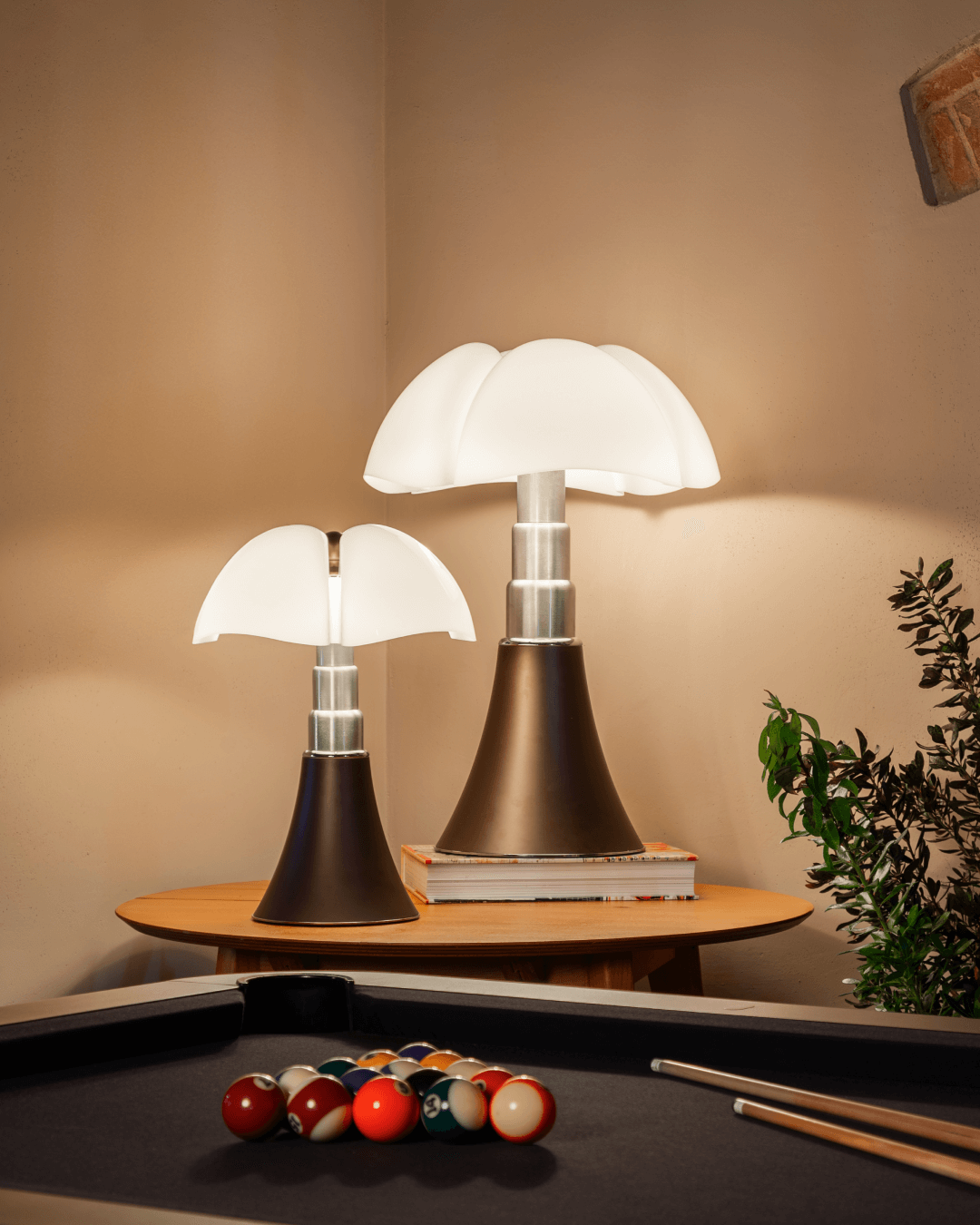 Come la lampada Pipistrello di Gae Aulenti che, nella versione bronzo, si inserisce con disinvoltura nella palette del Mocha Mousse. La lampada, prodotta da Martinelli Luce, è una delle opere più significative dell’architetto e ancora oggi ha una portata dirompente.