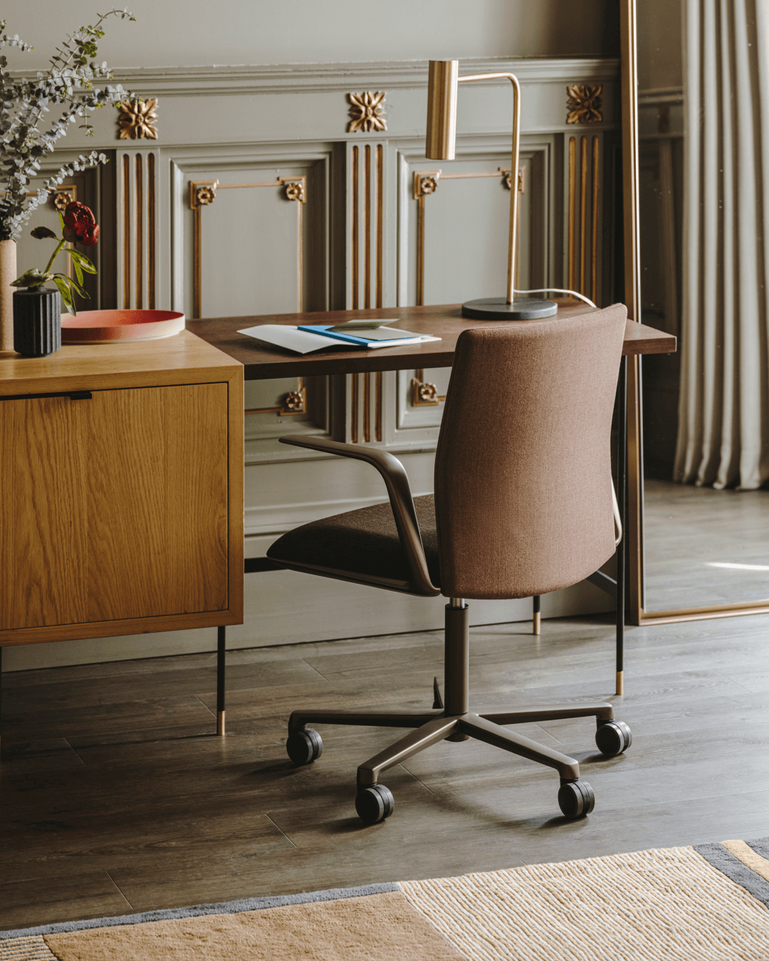 Lo stesso colore assume uno stile completamente diverso nel divano Shaal di Arper: disegnato dallo studio Doshi Levien è come un cesto foderato di morbidi cuscini e nella versione Mocha Mousse è accogliente e sofisticato. La stessa azienda propone, per la zona studio, la seduta Kinesit Met di Lievore Altherr Molina: dal 2021 disponibile in una palette di toni caldi e materici perfettamente in armonia con il Mocha Mousse.
