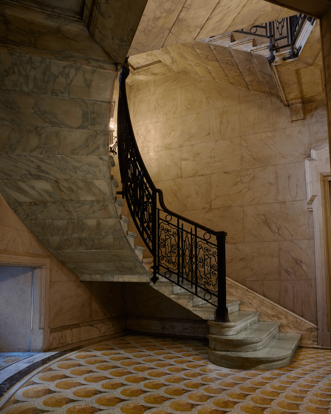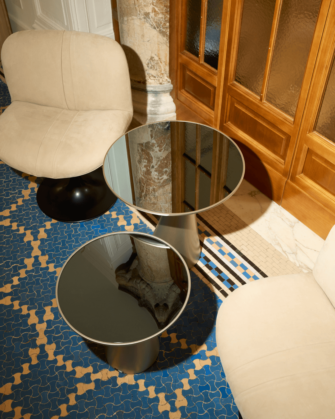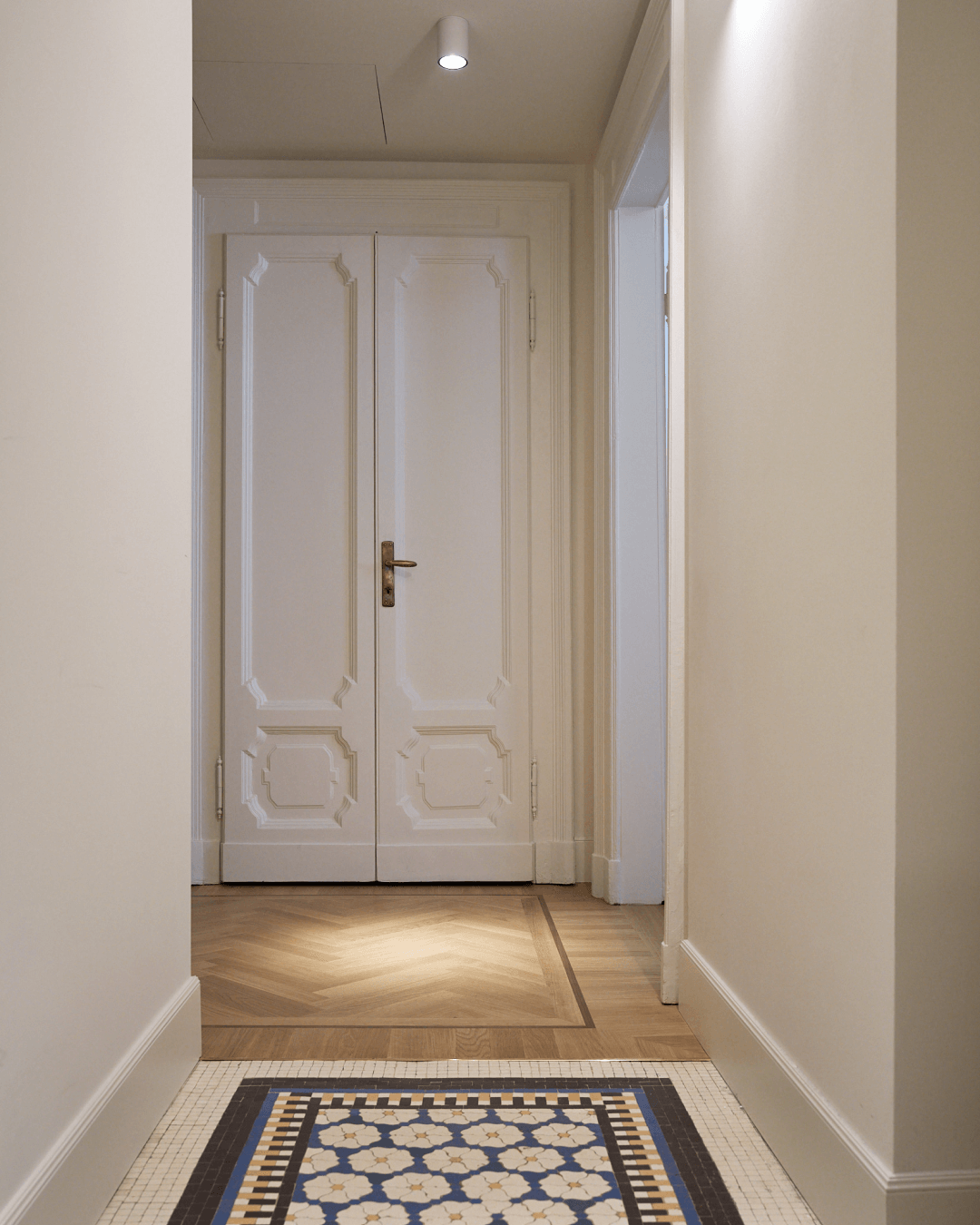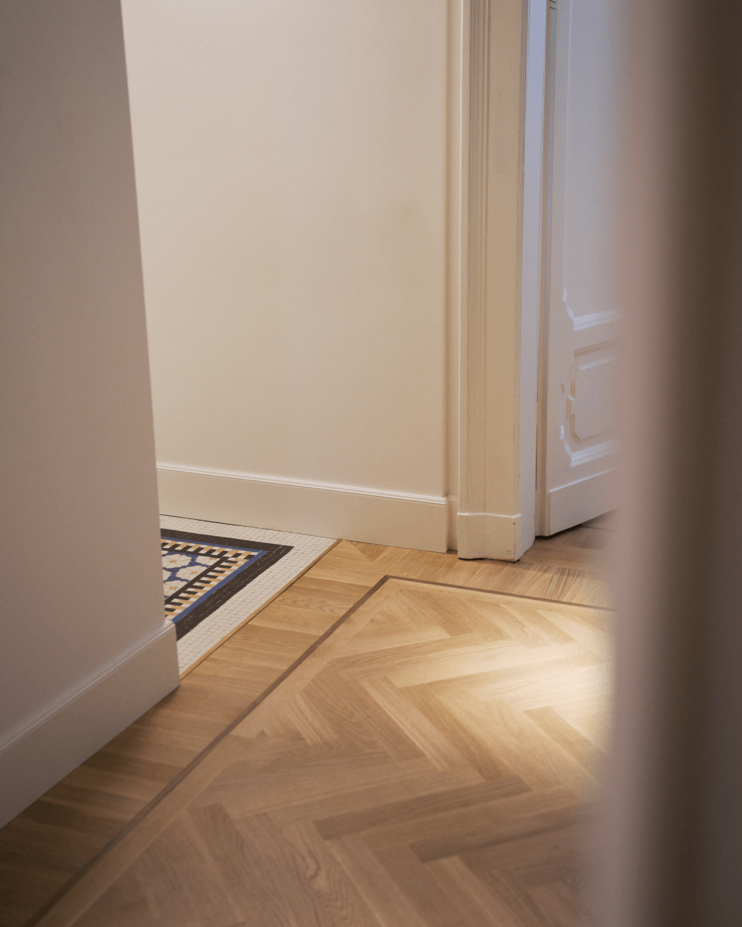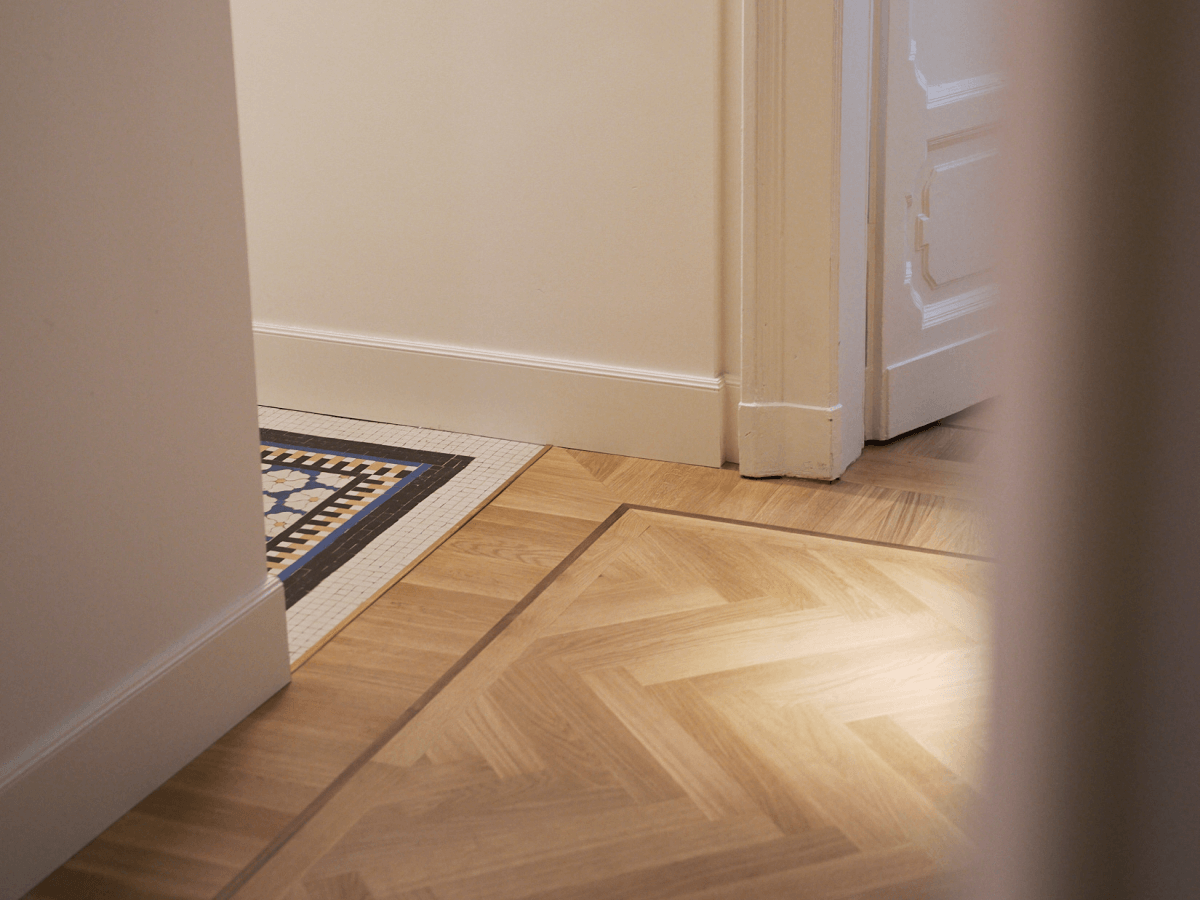 La coesistenza tra le due pavimentazioni costruisce un dialogo fatto di contrasti controllati: alla densità grafica del mosaico risponde la misura del legno, alla complessità decorativa si affianca una trama più regolare, capace di dare respiro e continuità.