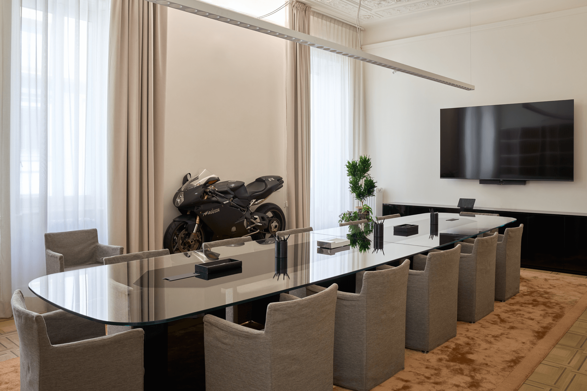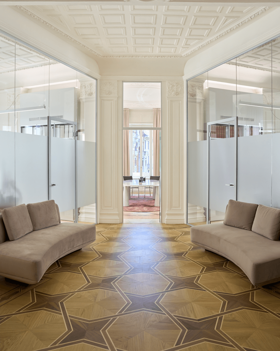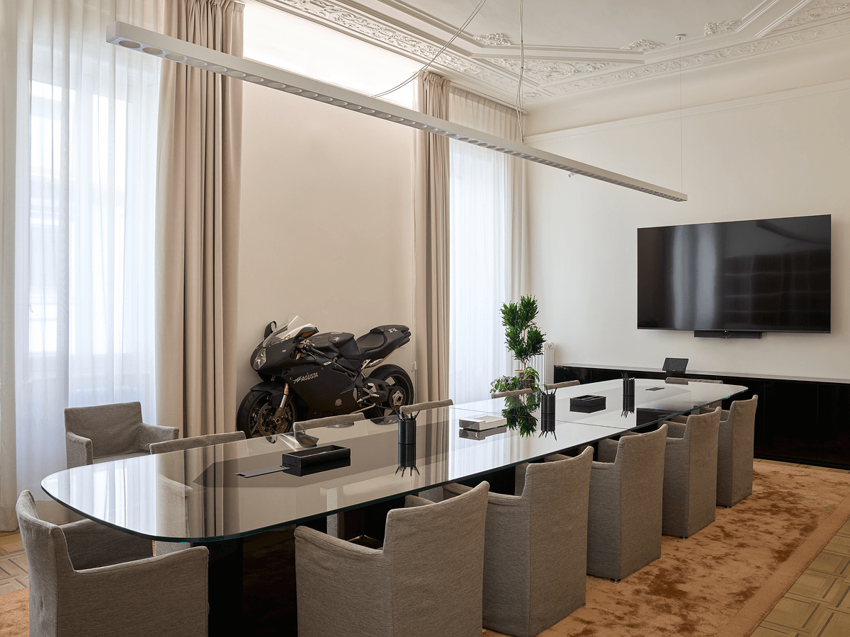 Gli spazi si susseguono in modo fluido, scanditi da soglie, aperture e quinte che incorniciano viste sempre diverse. Le aree di lavoro, dalle sale riunioni fino alle zone ricettive, assumono così un carattere inedito. Non sono uffici nel senso tradizionale del termine, ma luoghi in cui la dimensione operativa convive con quella culturale e simbolica. Le partizioni in vetro delimitano le postazioni private senza interrompere la continuità visiva e permettendo alla luce naturale di attraversare gli spazi mantenendo una percezione unitaria dello spazio. Una scelta che privilegia la trasparenza evitando compartimentazioni rigide e restituendo una sensazione di apertura controllata.