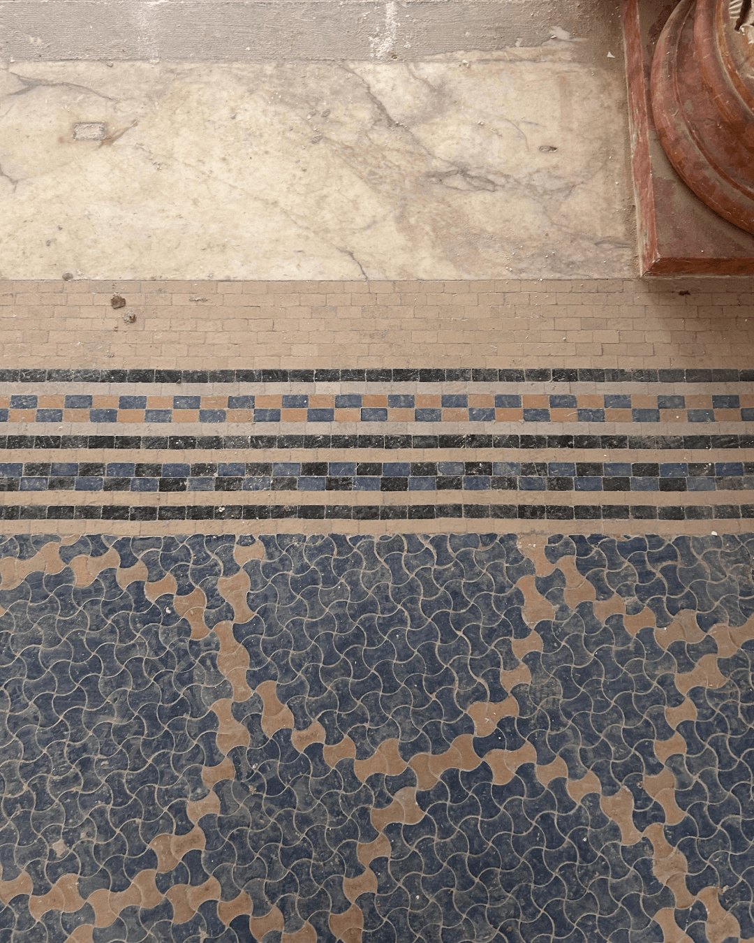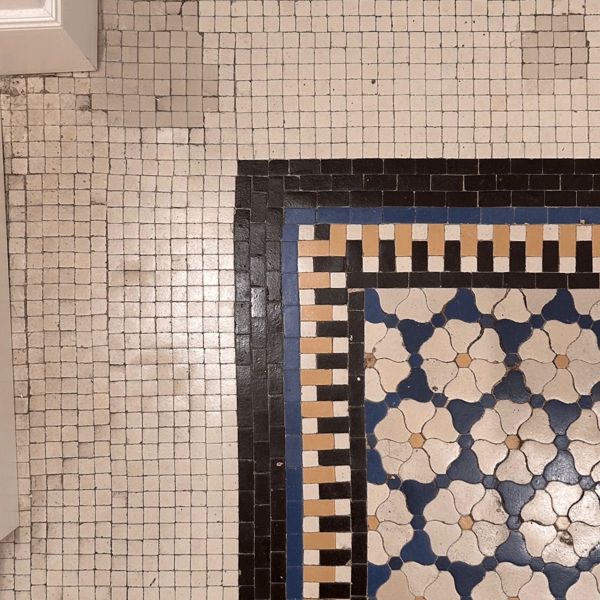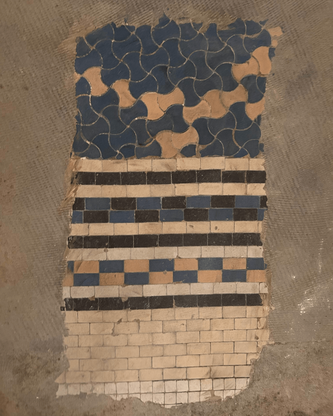 I mosaici geometrici riconducibili alla tradizione di inizio Novecento, riportati alla luce con una cura meticolosa, conservano variazioni cromatiche e lievi irregolarità che raccontano il tempo attraverso la materia.