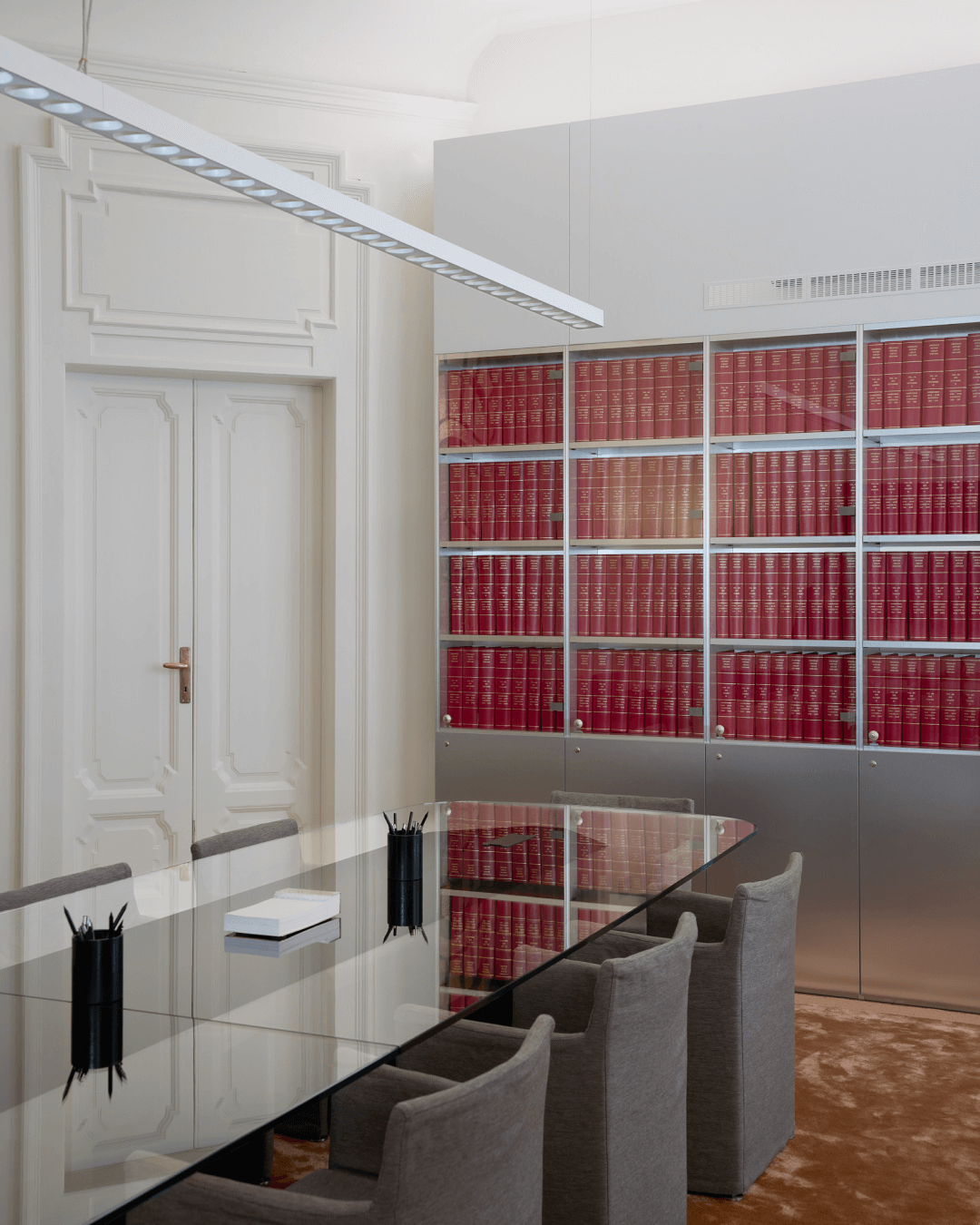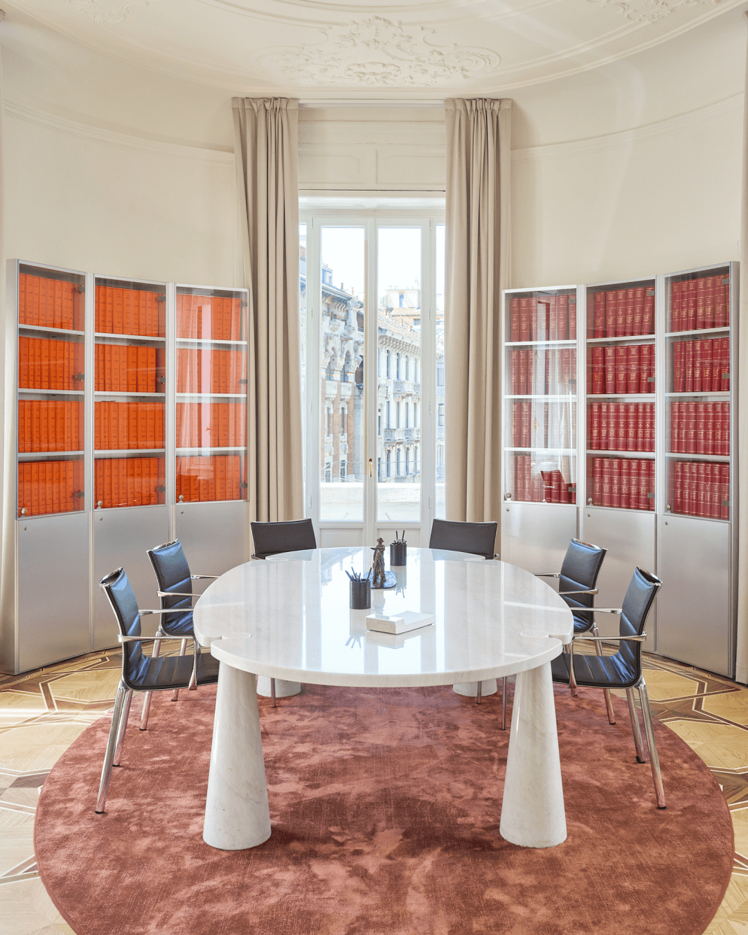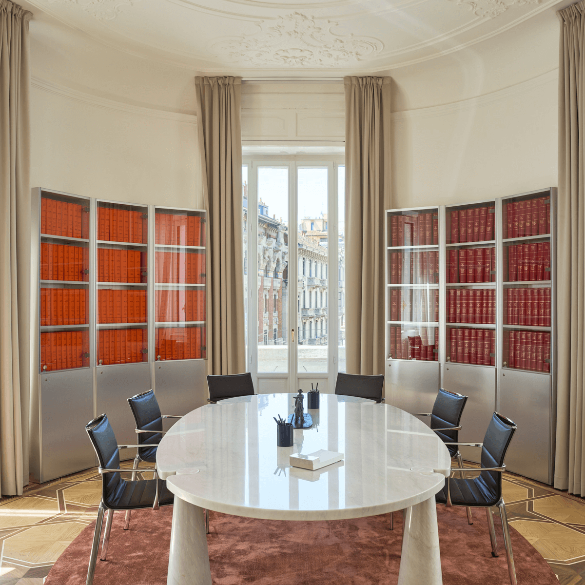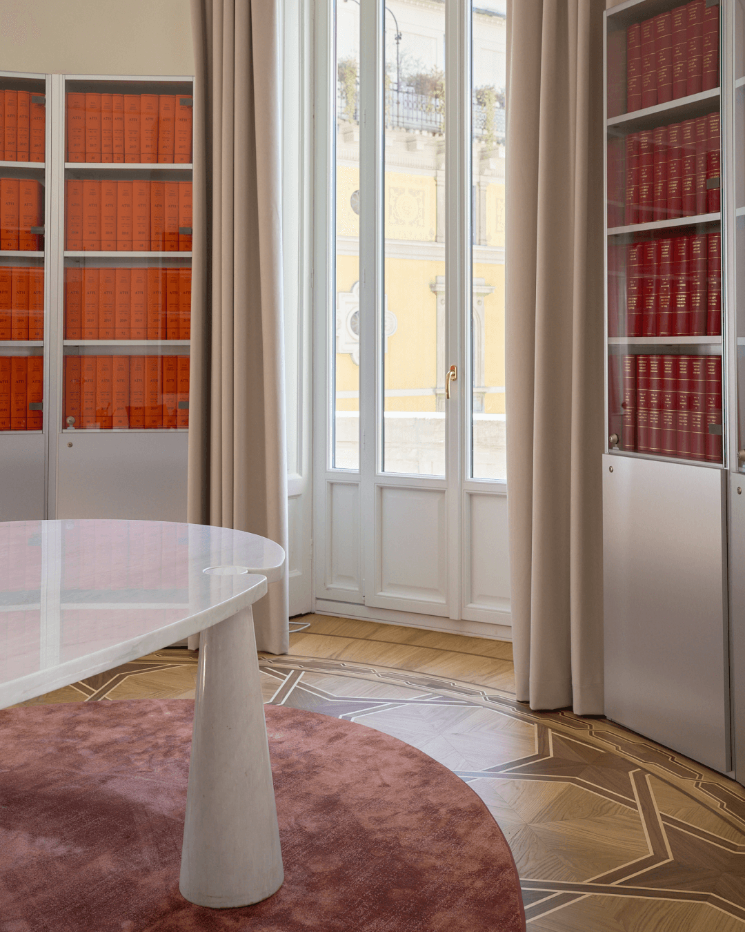 Tavoli scultorei in marmo e vetro, sedute dal profilo essenziale, contenitori metallici e superfici riflettenti introducono una nuova grammatica, fatta di precisione, funzionalità e controllo formale. Molti elementi sono stati progettati su misura per accogliere raccolte documentali storiche che qui trascendono la loro funzione puramente archivistica, introducendo accenti cromatici che interrompono la neutralità della palette e concorrono a costruire una composizione visiva stratificata.