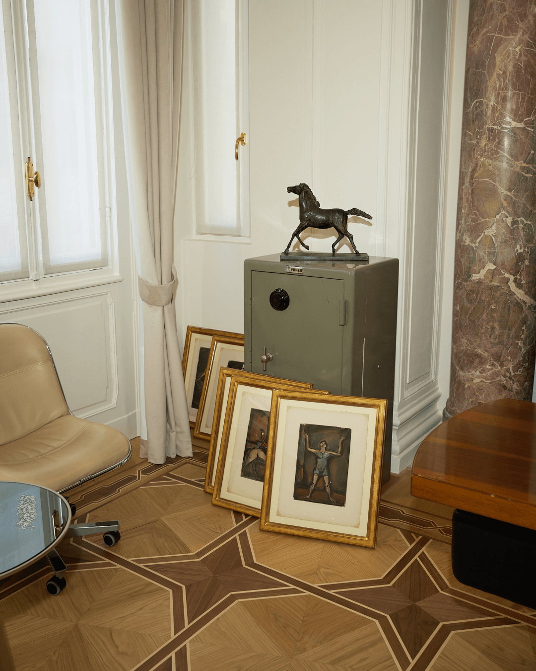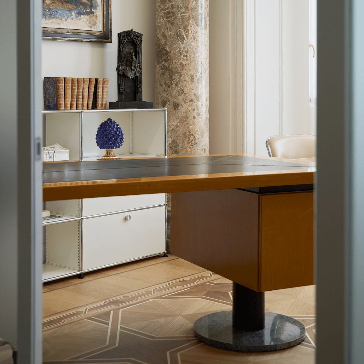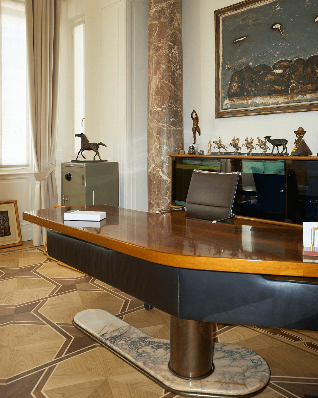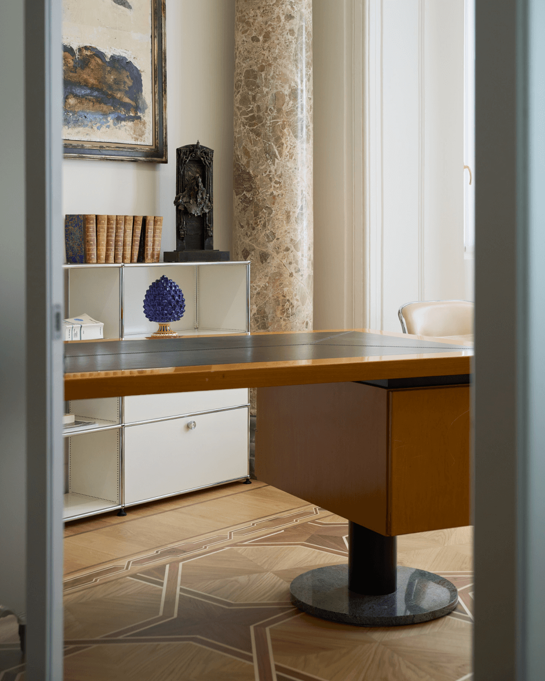 Tavoli scultorei in marmo e vetro, sedute dal profilo essenziale, contenitori metallici e superfici riflettenti introducono una nuova grammatica, fatta di precisione, funzionalità e controllo formale. Molti elementi sono stati progettati su misura per accogliere raccolte documentali storiche che qui trascendono la loro funzione puramente archivistica, introducendo accenti cromatici che interrompono la neutralità della palette e concorrono a costruire una composizione visiva stratificata.