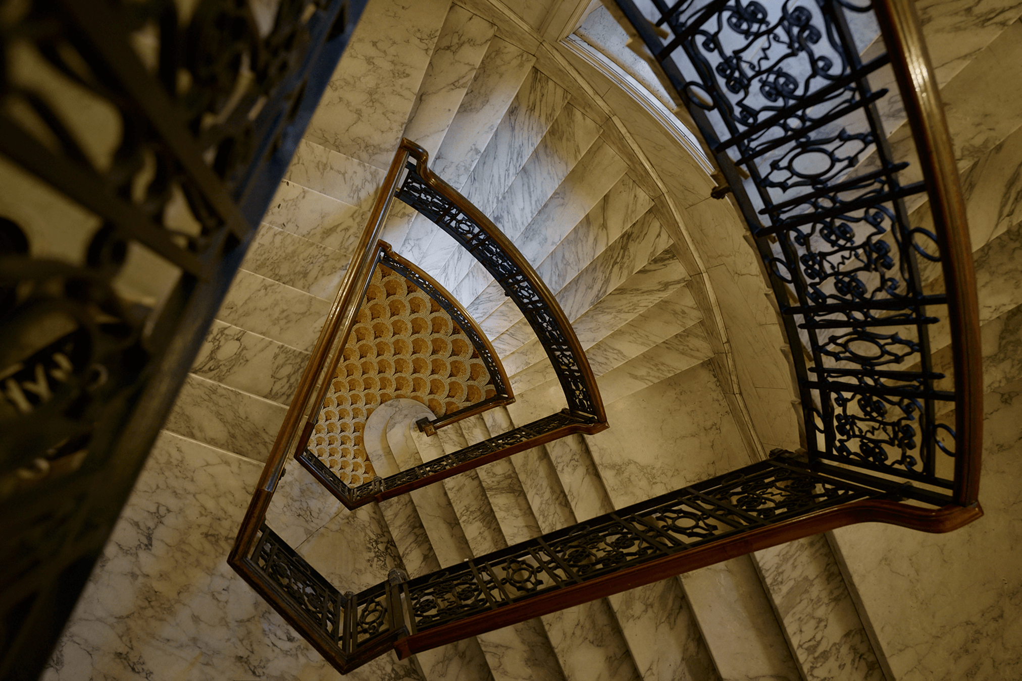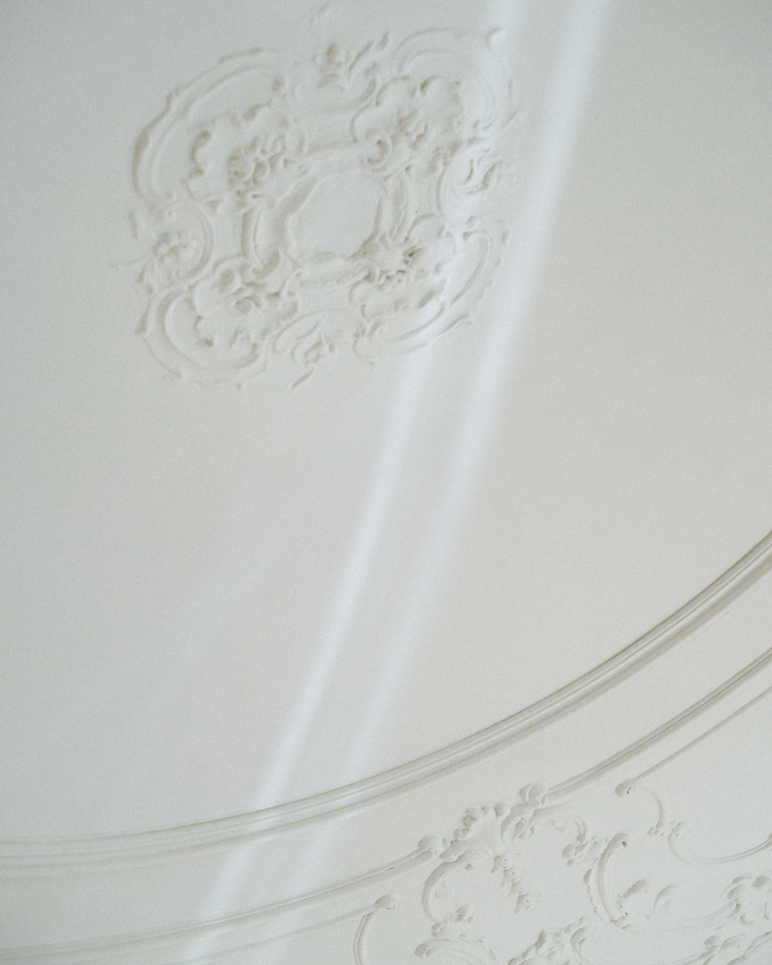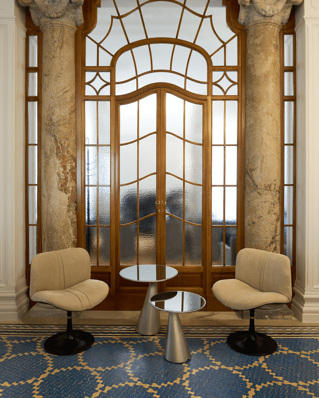 Le colonne in marmo e gli stucchi d’epoca, che scandiscono soffitti e pareti, vengono mantenuti come riferimenti stabili all’interno dello spazio, tracce di un passato che diventa struttura portante del racconto.